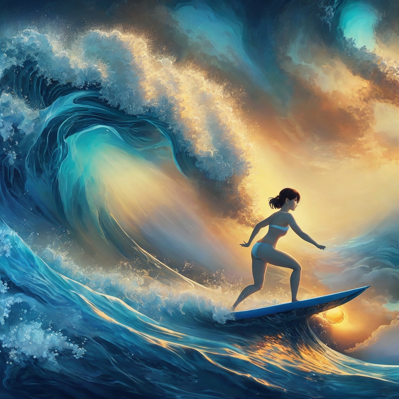 Prompt: Great Wave off Kanagawa, perfect imagery of a beautiful young lady surfing inside it, beautiful clear ocean's waters, acrylic art,