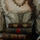 A woman in a vintage dress holds a stack of ornate leather-bound books. Her braided hair is complemented by a striking necklace, set against a softly lit, elegant background.