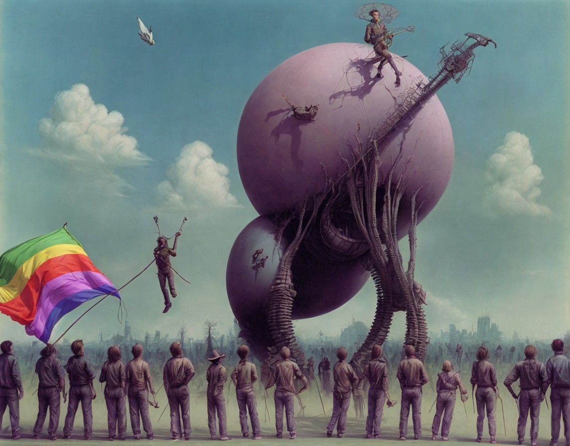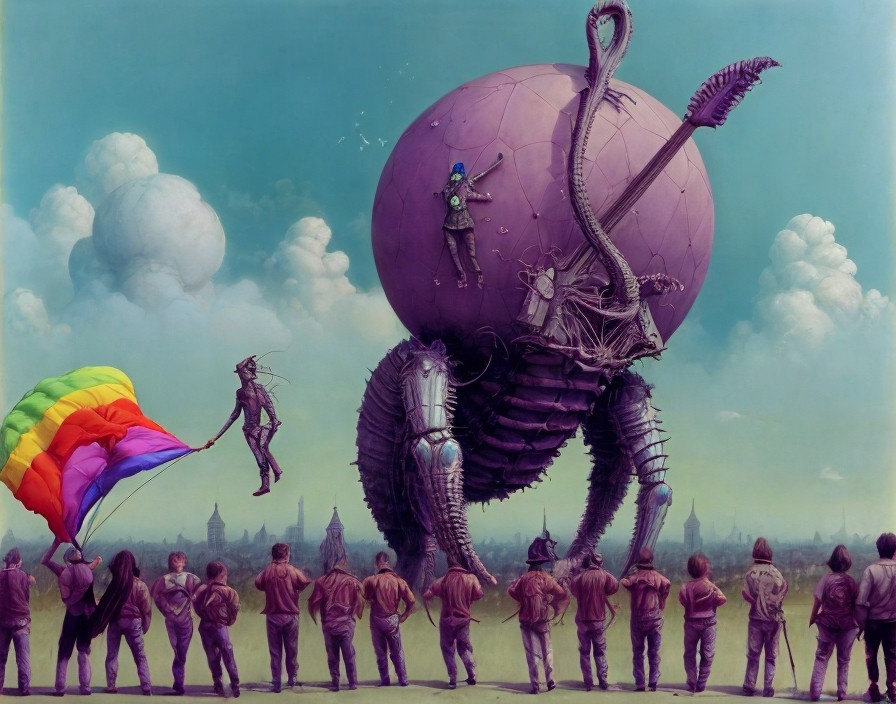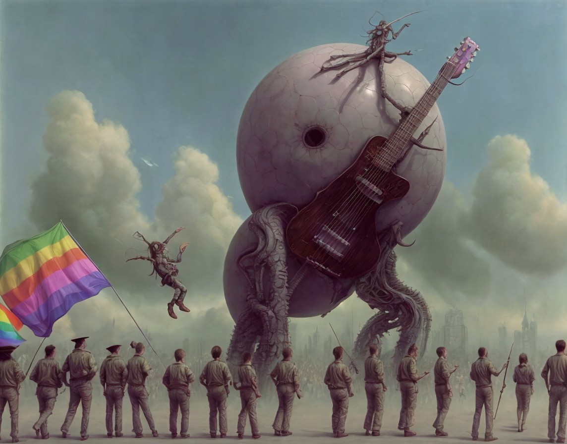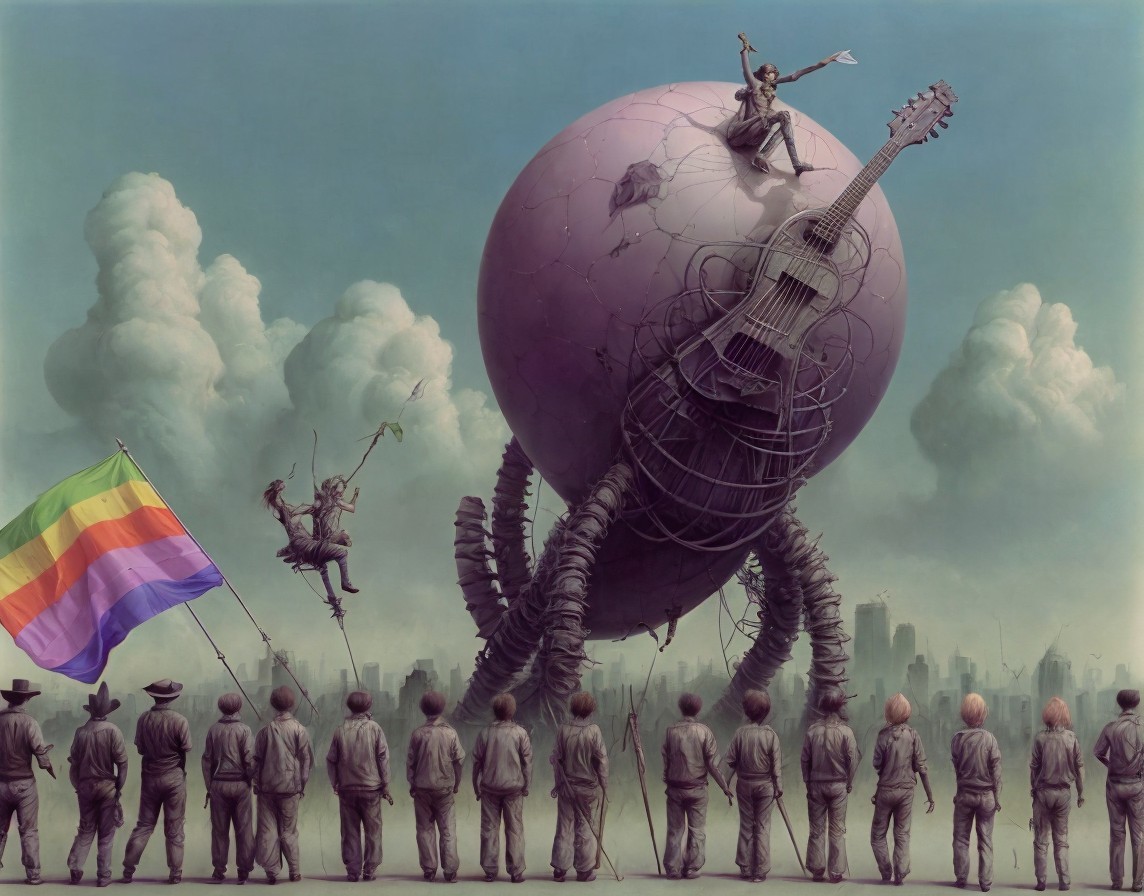 Surreal artwork with a giant creature playing guitar, people marching, a child with a rainbow flag, and floating spheres in the background.
