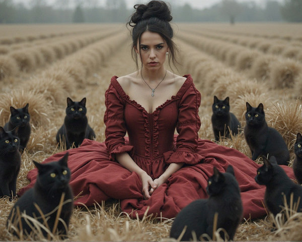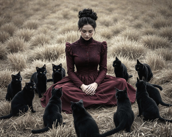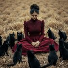 A woman in a vintage burgundy dress sits in a dry field surrounded by a circle of black cats, creating a mysterious and enchanting atmosphere. The scene evokes a sense of magic and connection.