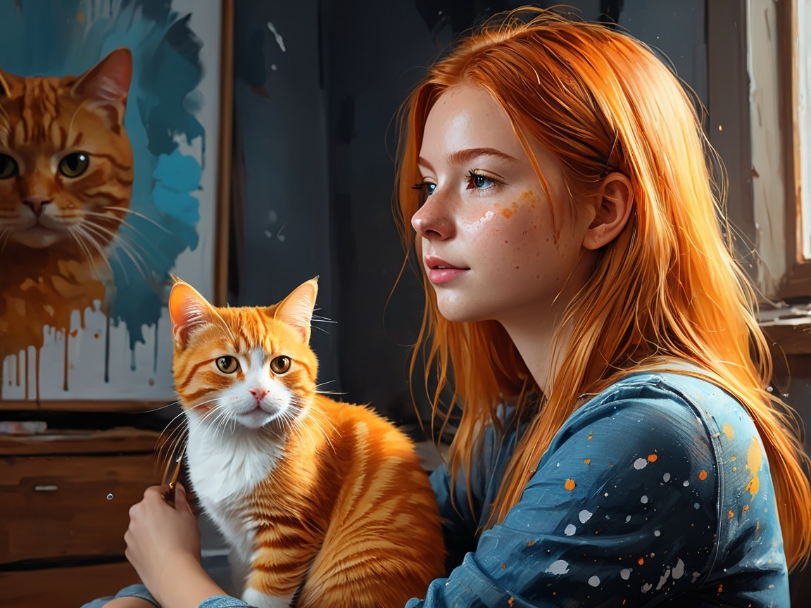 A girl with vibrant orange hair and freckles sits with an orange tabby cat. The background features a painting of a similar cat, adding warmth to the cozy, artistic atmosphere.