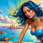A vibrant scene showcases a city skyline with soaring skyscrapers under a bright sky. A glamorous woman in a blue top is in the foreground, enhancing the lively atmosphere of adventure and beauty.