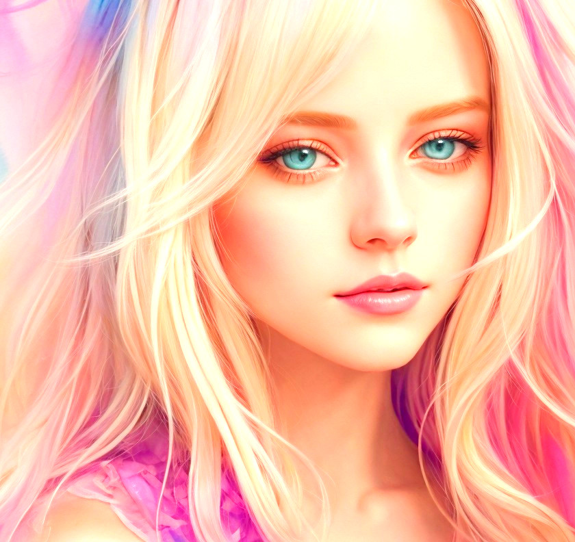 Portraiture in warm pastel colors, watercolor and ink, gazing, babe with very light blonde hair, magical, maximalism, illustrative stylization 1.6, hues, eroticism, cottagegore 1.9, serene, somber, vivid, 3d effects 1.8, iridescent fractal background, layered geometrical vector art, style of Margaret Keane, Overton Loyd and Didier Lourenço,