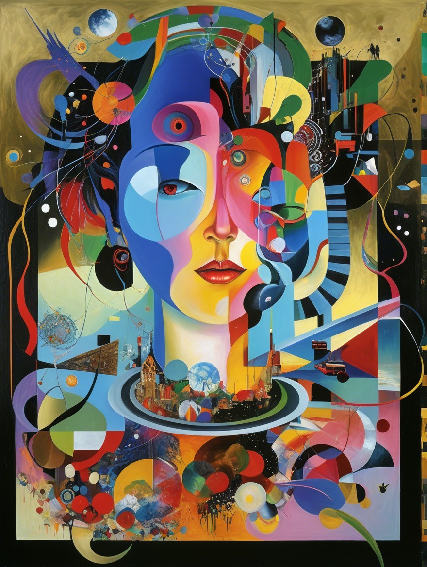The artwork features a vibrant, abstract portrait with bold colors and geometric shapes. The face is stylized with striking features, surrounded by dynamic lines and circular elements.