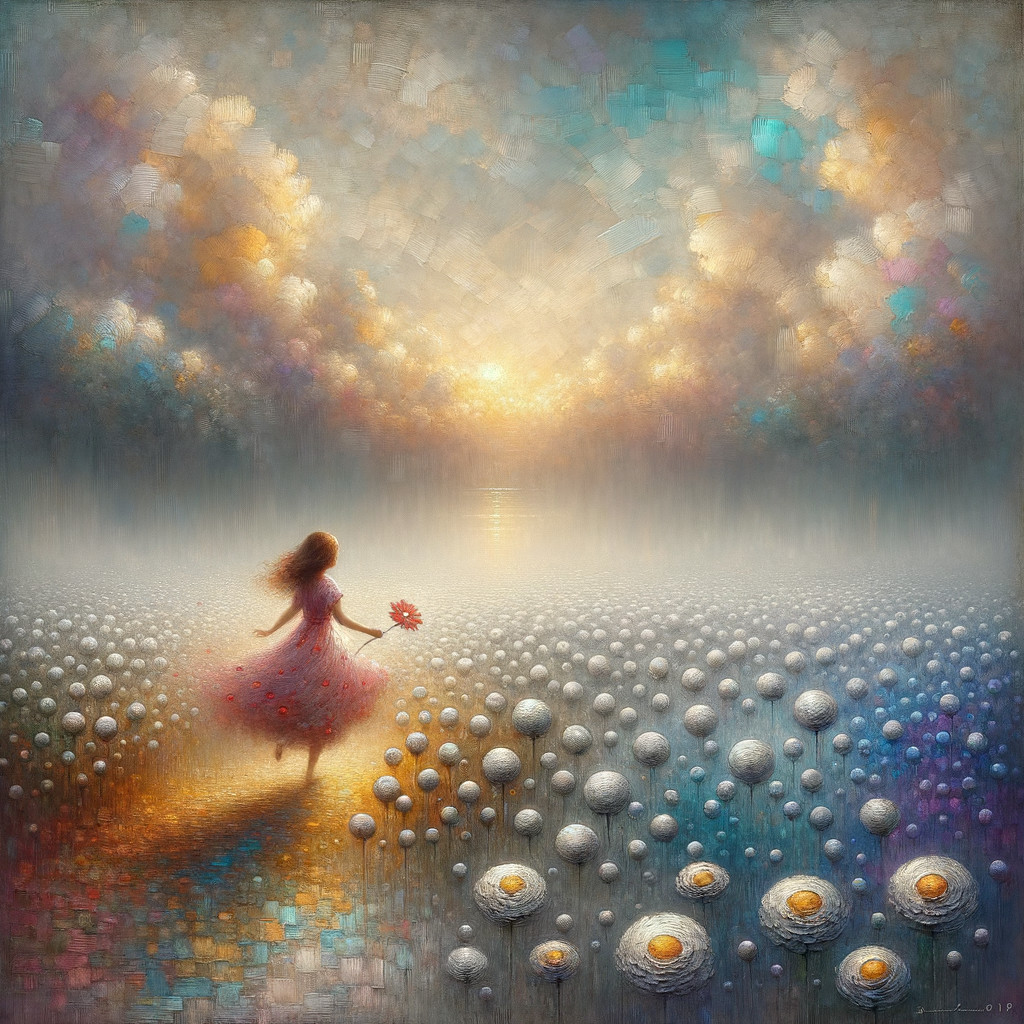 Prompt: "A mesmerizing fusion of Impressionism and minimalism unfolds in this illustrious artwork. Picture a textured canvas brought to life by pigmented enamel, blending silver, blue, purple, off-white, and pistachio tones. Delve into a field of silver orbs, the Coreopsis ‘Golden Orb,’ depicted with swift impressionistic strokes, merging seamlessly with a misty horizon illuminated by soft, diffused light. The scene is graced by a radiant golden light, casting a mystical aura. In the foreground, a young girl, clad in a pink dress with red1 dots and amber hair, walks towards the horizon, clutching a vibrant red flower. The composition is enriched by the stylization reminiscent of Gabriel Pacheco and Pablo Auladell, offering a 2D illustration with a hazy, luminous backdrop. Revel in the depth and uncluttered space, where the interplay of light creates an enchanting atmosphere. The color palette is a masterpiece in itself, with correct anatomical proportions enhancing the overall allure of this captivating creation."