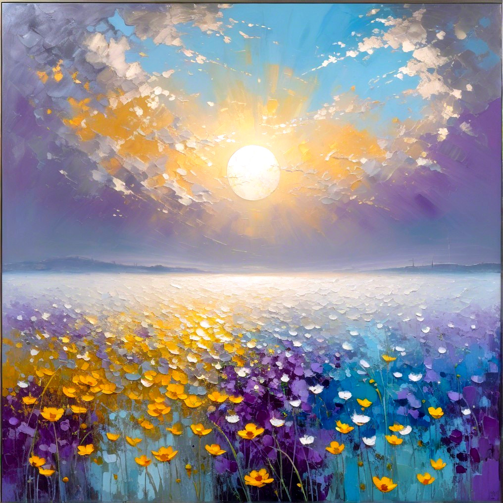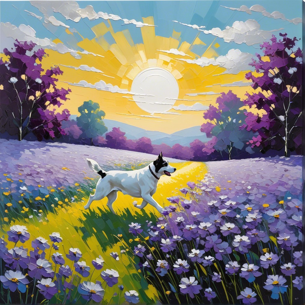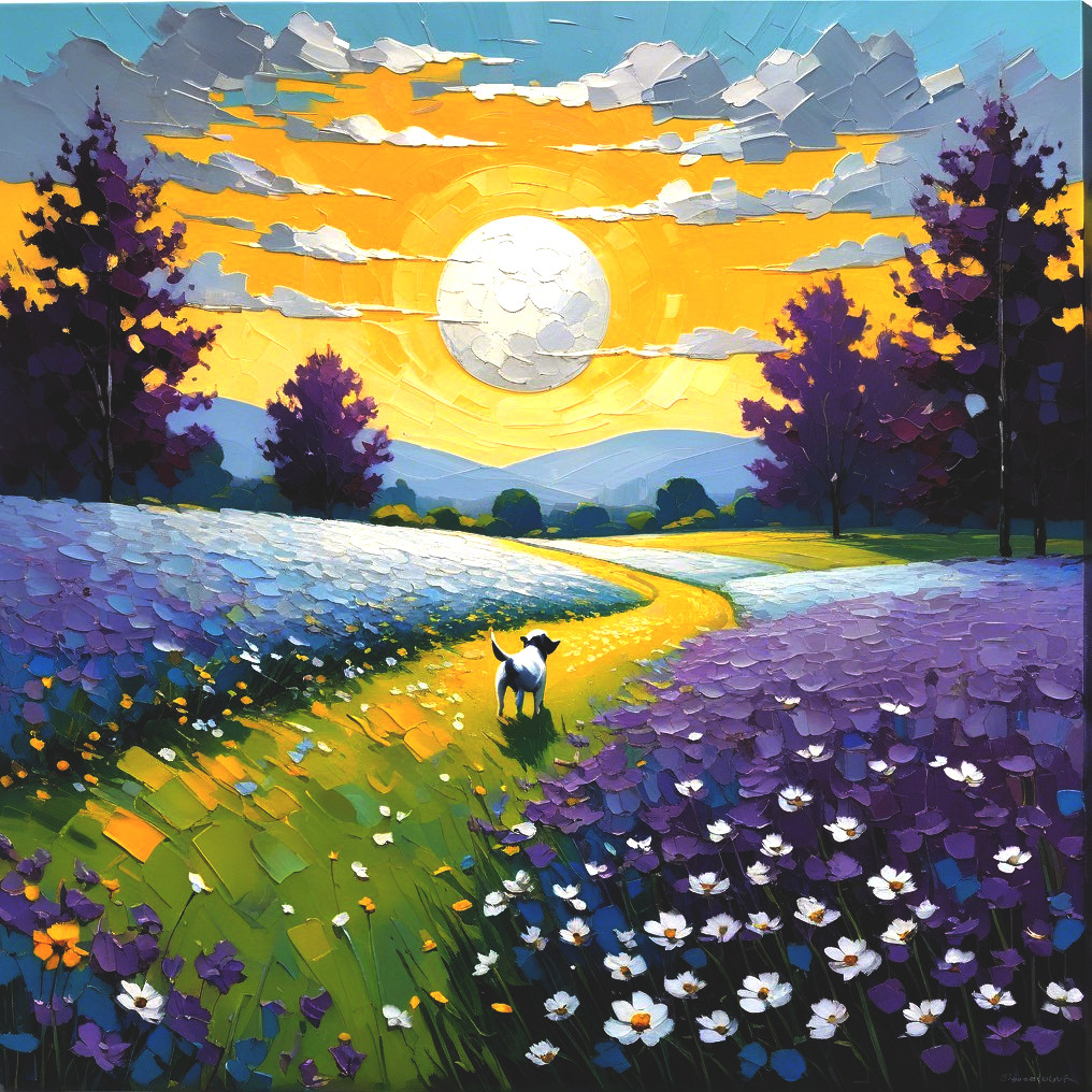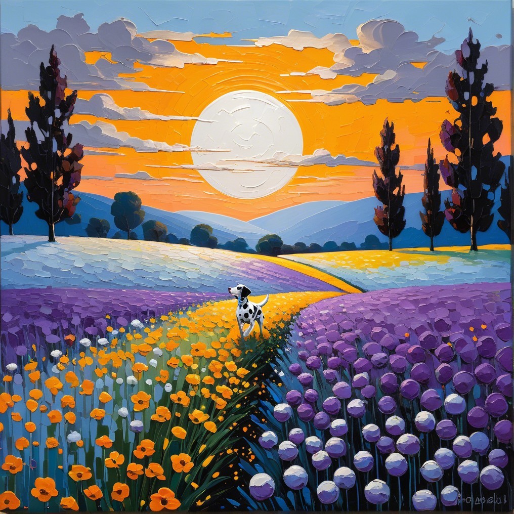 A mesmerizing fusion of Impressionism and minimalism unfolds in this illustrious artwork. Picture a textured canvas, rough, bold strokes, brought to life by pigmented enamel, blending silver, blue, purple, off-white, and pistachio tones. An orange-yellow sunset at the horizon.. In the distance covering the sun, a Dalmatian dog running through the flower field. Delve into one field of silver orbs, the Coreopsis ‘Golden Orb,’ depicted with swift impressionistic strokes, merging seamlessly with a misty horizon illuminated by diffused light.The composition is enriched by the stylization reminiscent of Gabriel Pacheco and Pablo Auladell, offering a 2D illustration with a hazy, luminous backdrop. Revel in the depth and uncluttered space, where the interplay of light creates an enchanting atmosphere. The color palette is a masterpiece in itself, with correct anatomical proportions enhancing the overall allure of this captivating creation.