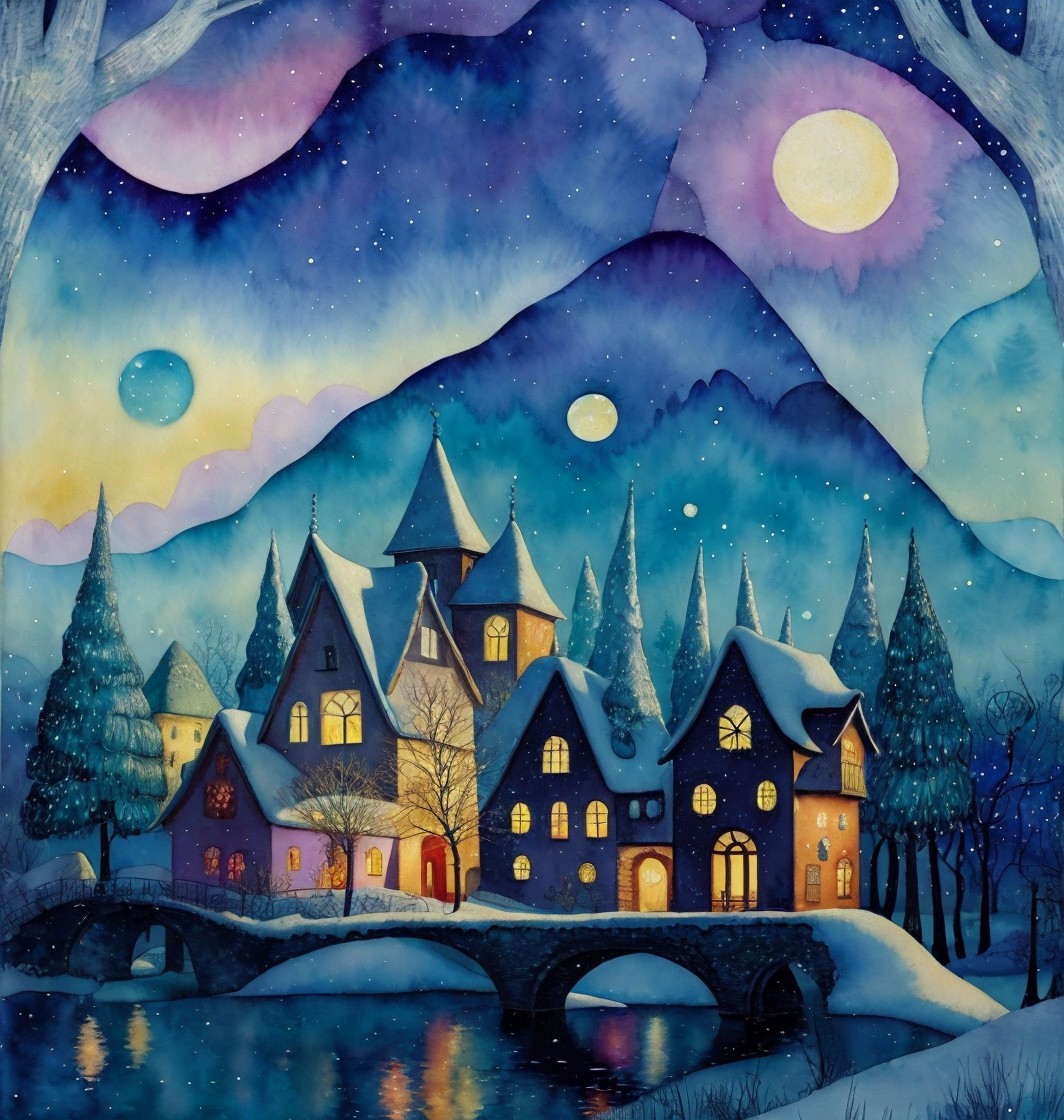 Beautiful winter trees, elegant, fantasy, intricate, very attractive, beautiful, watercolor, mystic, Paul Klee, art deco, Tim Burton, Yacek Yerka, Deep, Dee Nickerson, Van Gogh, funkelnd, very deep, glitzernder schnee, spirit in the sky.