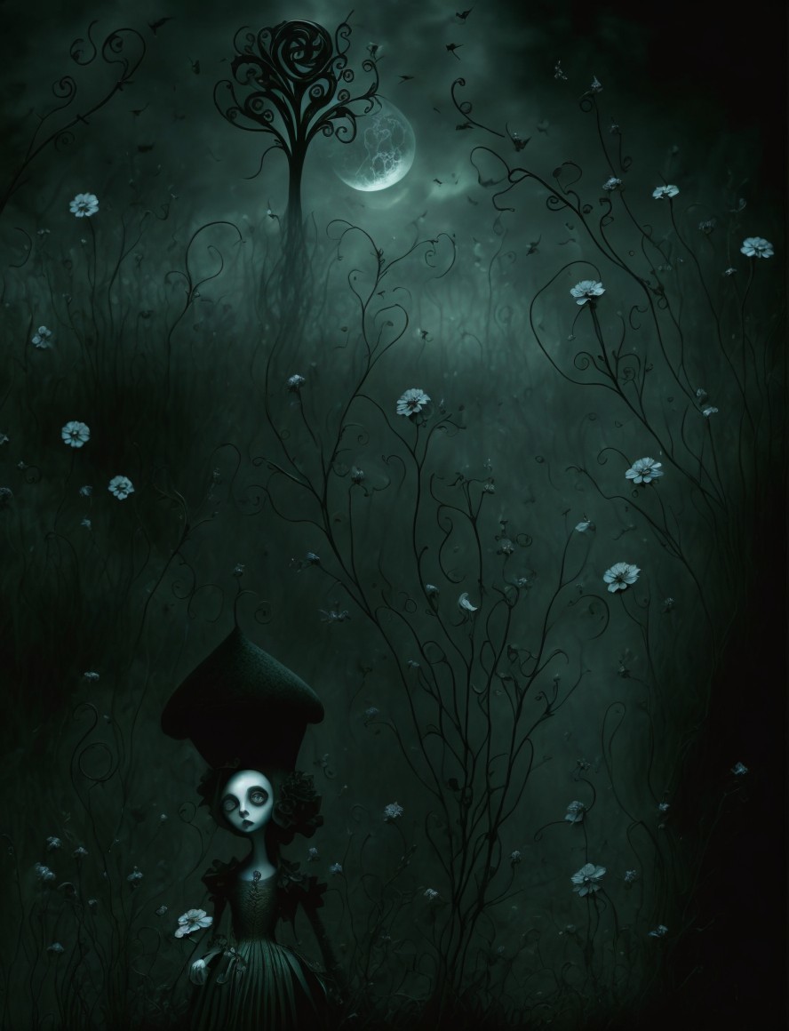 Nighttime garden with luminescent flowers, vines, and cozy cottage under crescent moon