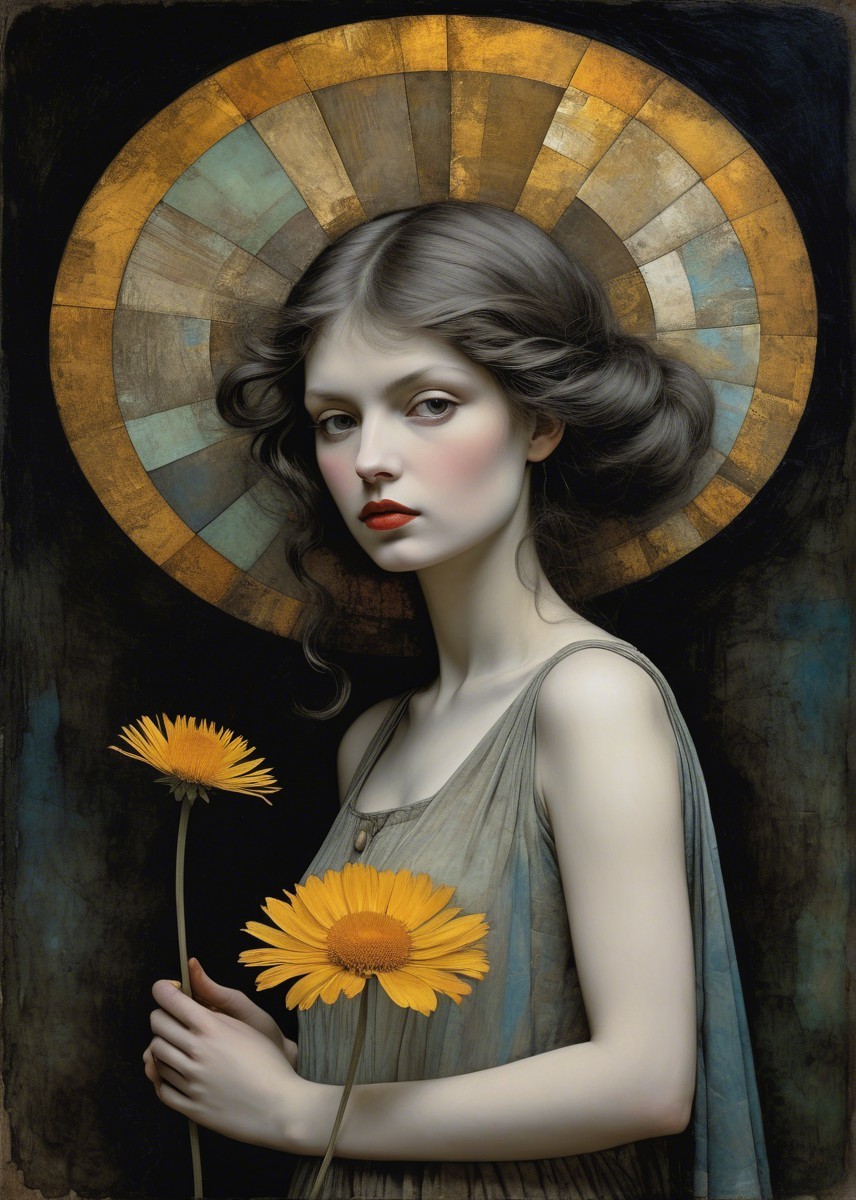 A young woman is depicted with a striking geometric patterned headdress, blending vibrant colors. Her expression is serene as she holds a slender staff, enhancing the artwork's intriguing allure.