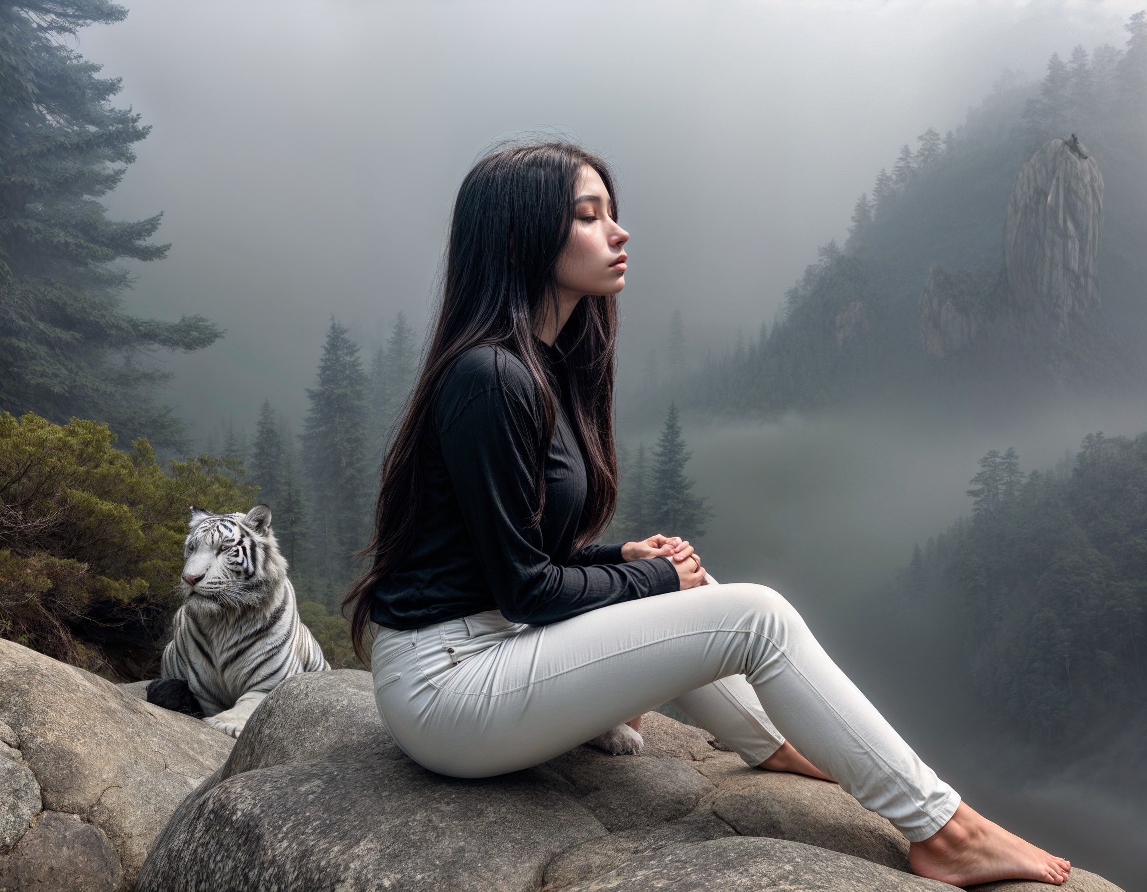 A woman sits contemplatively on a rock beside a white tiger in a misty, mountainous landscape.