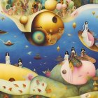 This ethereal artwork features serene figures on floating lotus flowers amid a tranquil water scene. Lush greens and vibrant blooms create a dreamlike atmosphere, evoking harmony and peace.