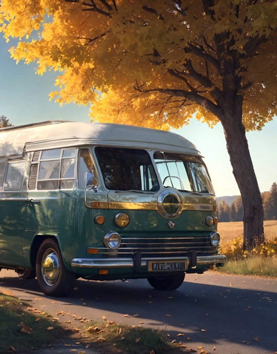 A vintage green and white bus parked on a serene road, surrounded by golden autumn leaves and a vibrant tree, capturing the essence of a classic road trip in nature.