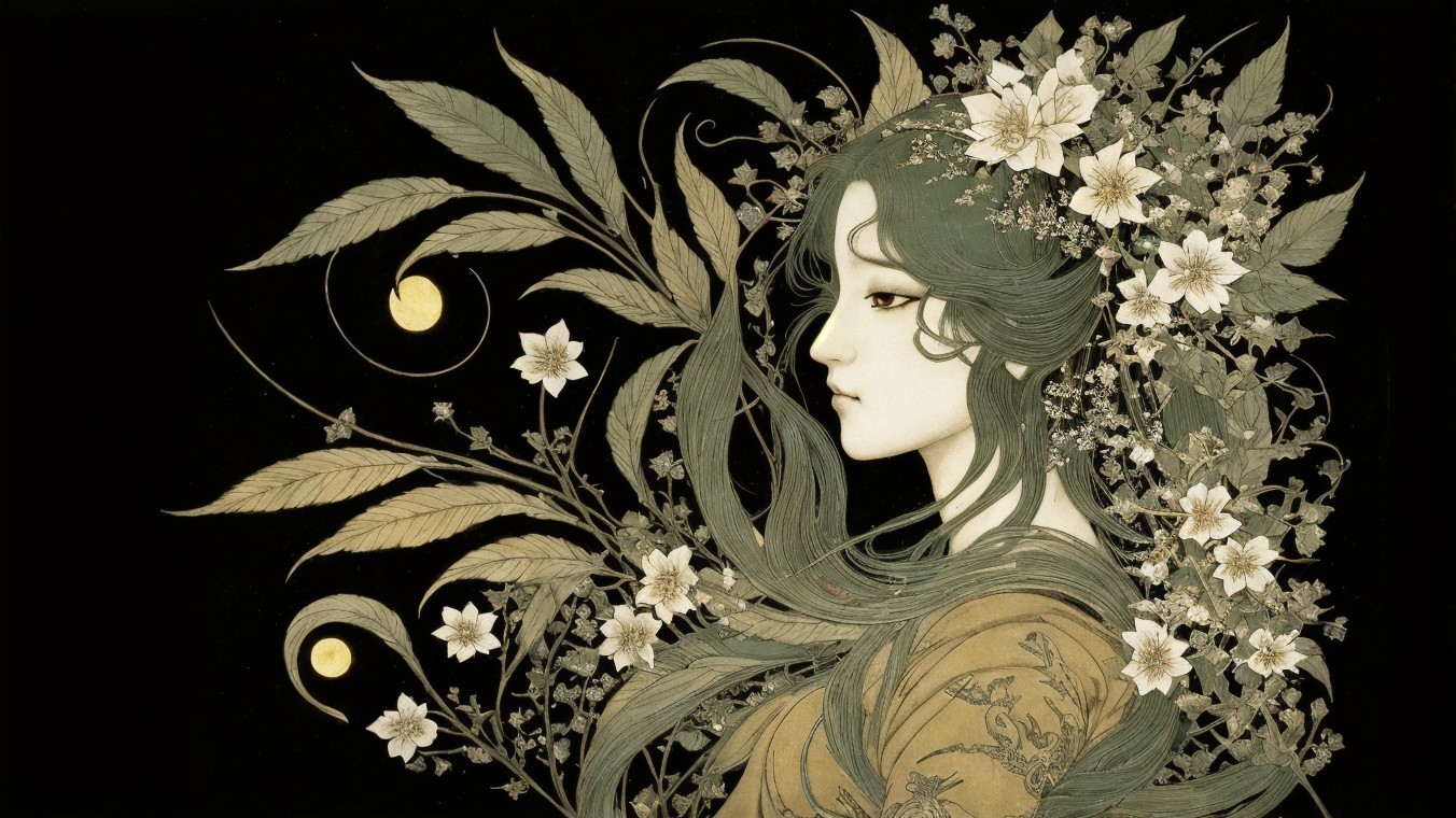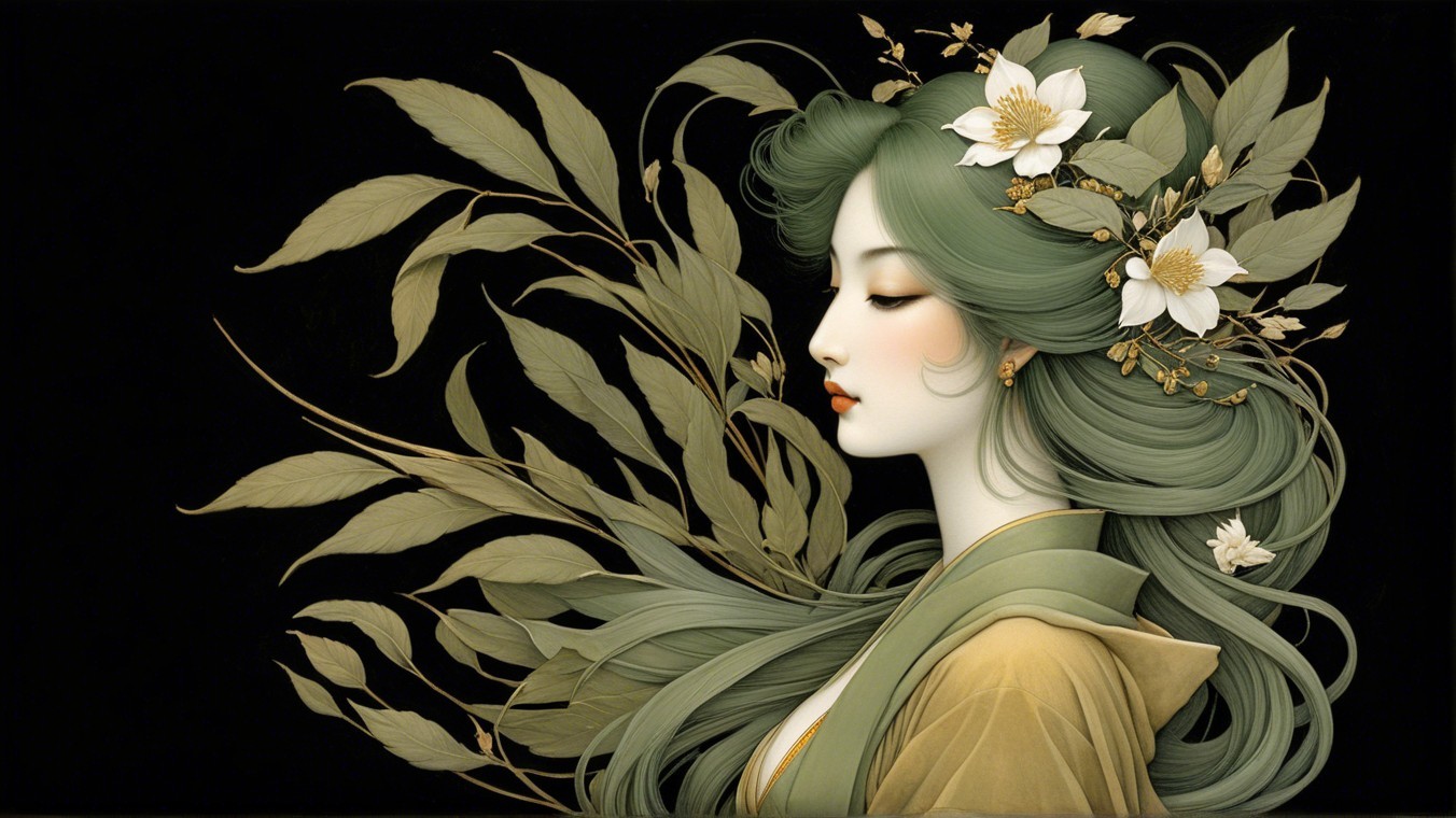 A serene woman with flowing green hair adorned with flowers and leaves. She is depicted in profile against a dark background, wearing an elegant golden outfit that complements her tranquil beauty.