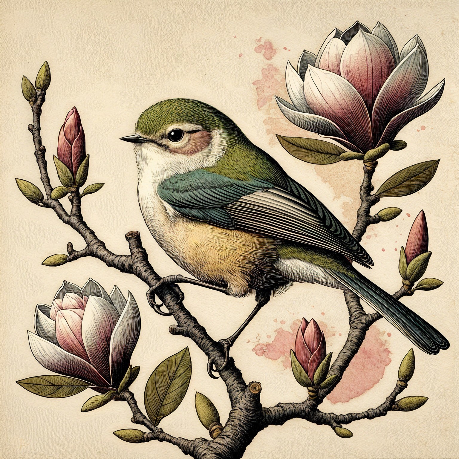 A vibrantly colored bird with blue and yellow feathers perches on a branch amidst blooming magnolia flowers, showcasing intricate details and a serene, natural backdrop.