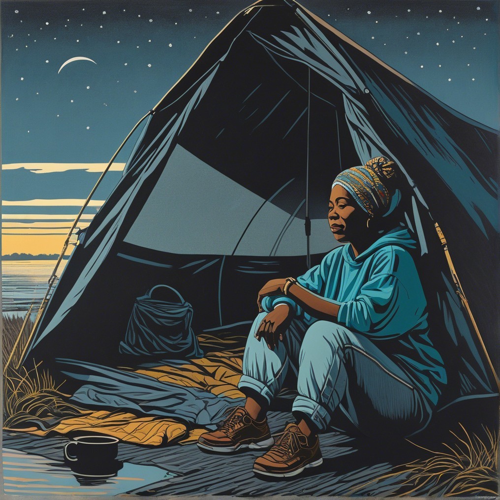 a large, beautiful older black woman is camping out, she is sitting outside her tent, she's wearing pants and a sweatshirt, night on the marsh and the fogs are croaking, elimated sun in distance only clouds and light, off center design, blues and yellows, faded grey turquoise in the sky, more distinct lines in the linocut, faded colors, vintage, the meadowlands marsh in New Jersey, sorrounded by marsh flowers including flat topped white astor, Water hemlock, creeping water primrose, blue vervain, spotted joe pie weed, greater fringed gentian,, , more distinct lines in the lino cut, add pale grey turquoise to the sky, a scene viewed in New Jersey, night in August, Intricate linocut art of grasses and flowers and faded dried flower heads, light gray, pale light grey blue, soft grey pink, olive, rust and dark greens, kay sage, raw figuration,, trompe l'oeil compositions, rusticcore , .. surreal, beautiful