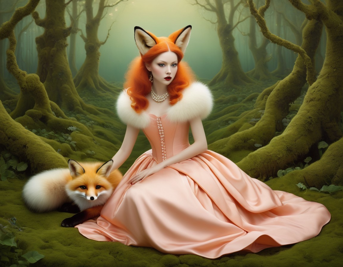 Prompt: "oil painting , luminism ,portrait of a beautiful ethereal eccentric little girl (( slightly smiling )) camouflaged as a fox, moonlight ,wildwood , forest ,nature , moss , grass growing everywhere , by mark ryden, natalie shau , michael sowa , low Brow Art ,contemporary high fashion dress designed by Galliano , Gaultier , pastel colors , colorful background , summer , paisley patterns , fairytale evil shadows , moody , enchanting , surreal, botanical elements , fibonacci , powder blue , green , black , gold , mysterious , intricate details , high definition , photorealistic , extravagant , wind , illuminated , dramatic lighting, soft , smooth"