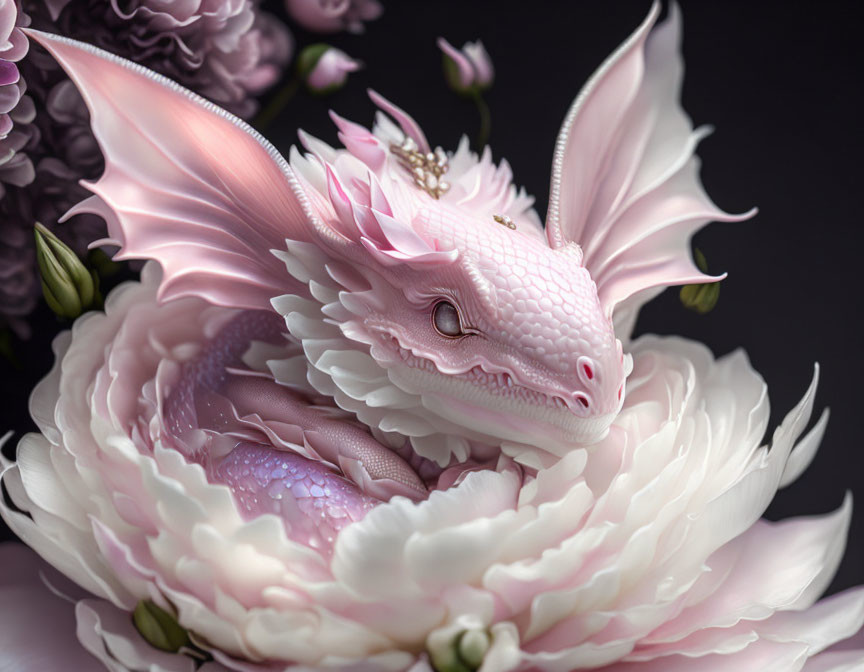 a tiny cute pale pink dragon sleeping in a white peony flower,