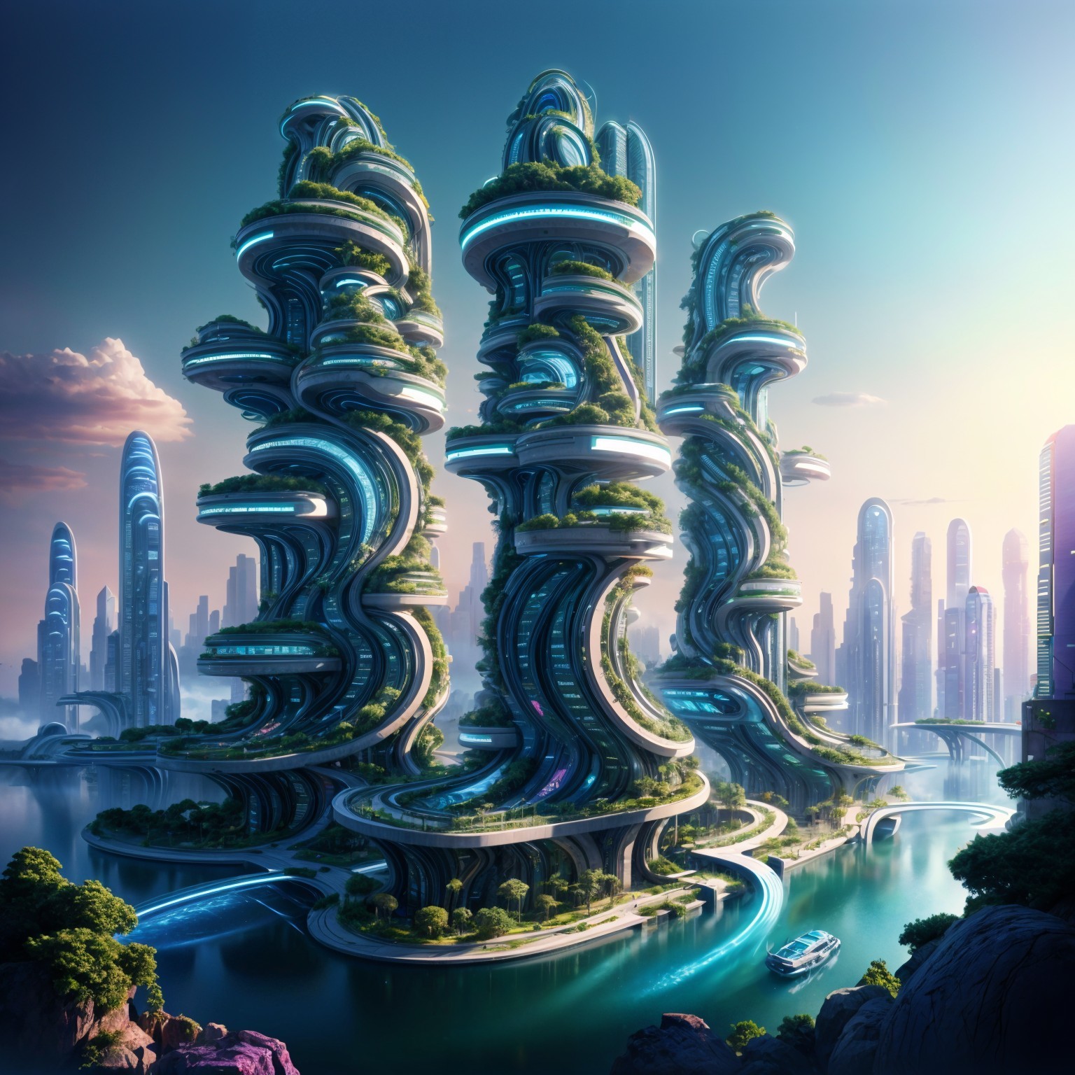 A futuristic cityscape features innovative architecture with flowing, organic shapes intertwined with greenery. A tranquil river reflects the sleek buildings, creating a harmonious urban environment.