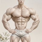 A muscular man stands confidently with a well-defined physique, showcasing impressive biceps, chest, and abs. He wears shorts and poses against a simple background with a natural setting.
