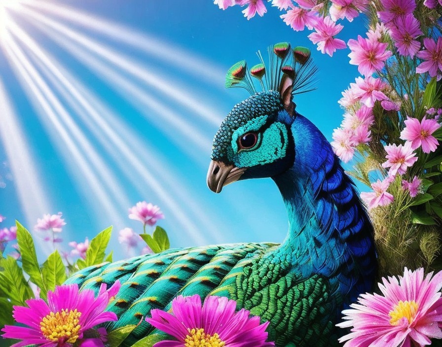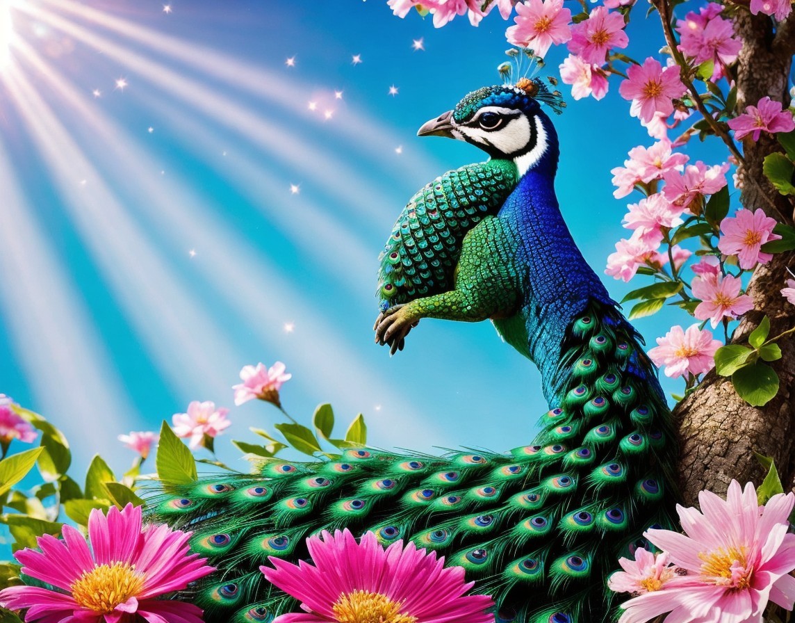Colorful peacock on tree branch with pink flowers under sunny sky