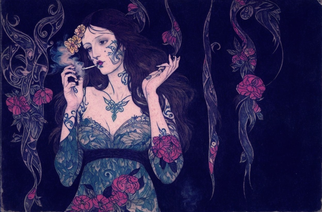 Two artistic figures with intricate tattoos and dark, smoky atmospheres. They hold cigarettes, exuding a gothic elegance, surrounded by floral motifs that contrast with their somber expressions.
