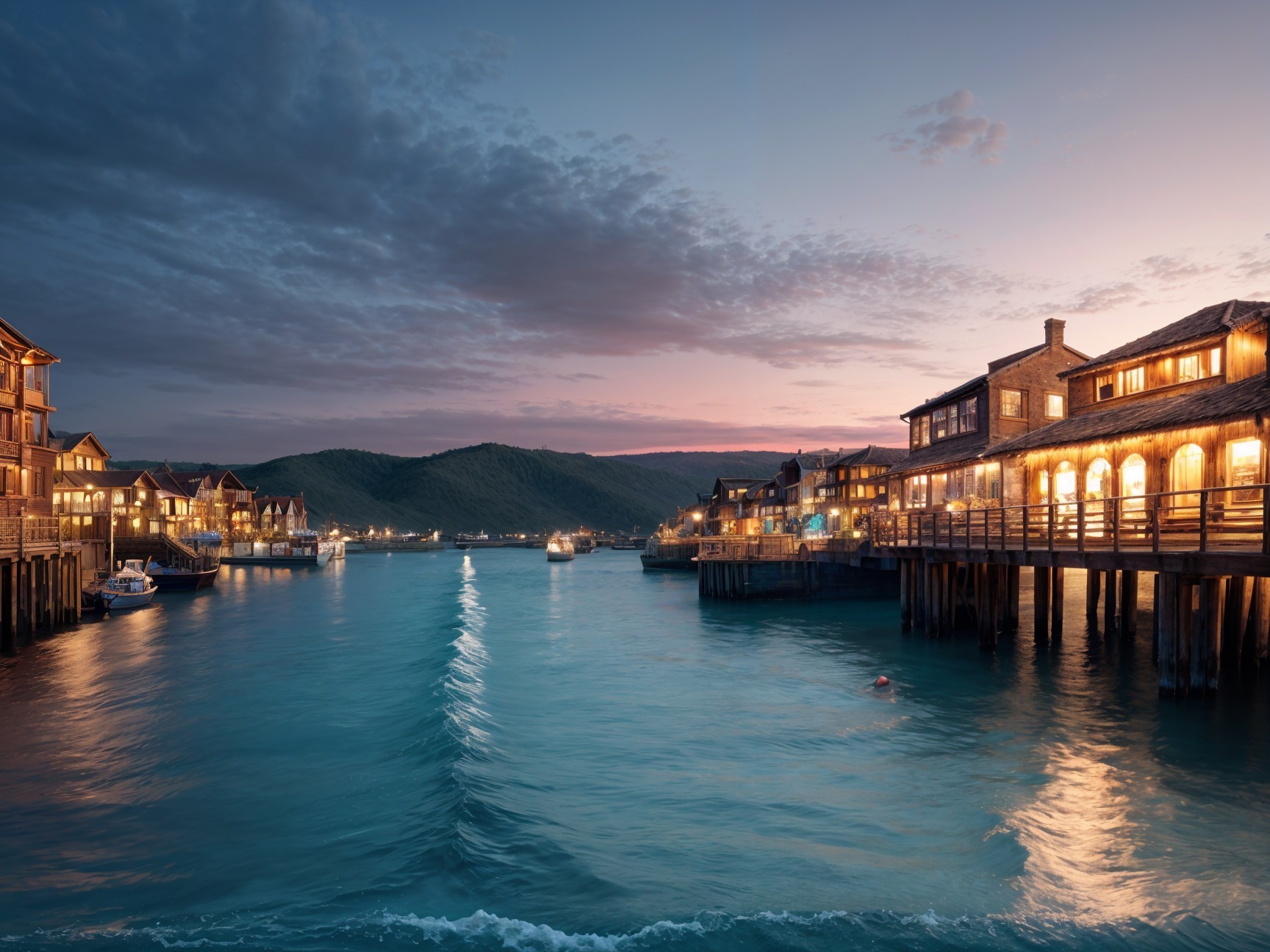 A serene harbor scene at sunset, featuring wooden piers, boats gently bobbing on turquoise waters, and scenic cliffs in the background. The light casts a warm glow over the tranquil setting.
