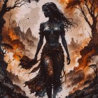 A mystical figure walks through a fiery forest, adorned in dark, flowing attire. Her striking features and tattoos evoke power, while swirling leaves and flames create an enchanting backdrop.