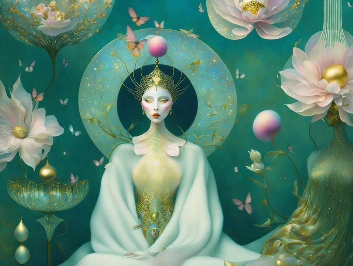 The image features a serene figure adorned with intricate designs and a crown, surrounded by ethereal flowers, soft colors, and delicate butterflies, evoking a dreamlike, mystical atmosphere.