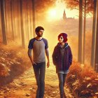 A young man and woman stroll through a vibrant forest at sunset, surrounded by autumn foliage. A distant city skyline glimmers as warm light filters through the trees, creating a serene atmosphere.