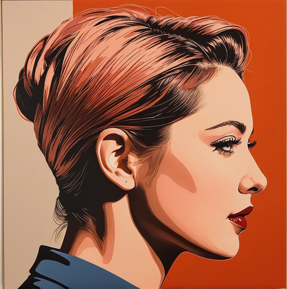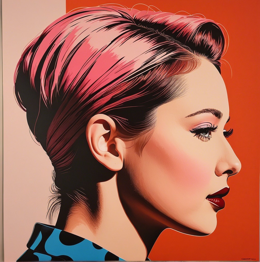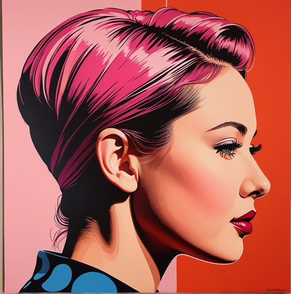 A vibrant pop art portrait features a woman in profile with striking pink hair and bold makeup. The background contrasts bright orange and light pink, enhancing her expressive features.