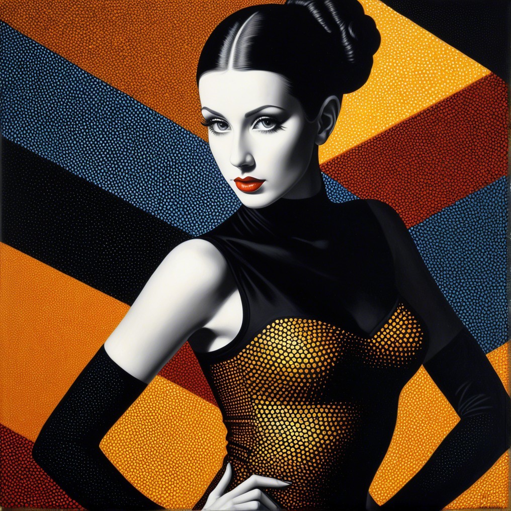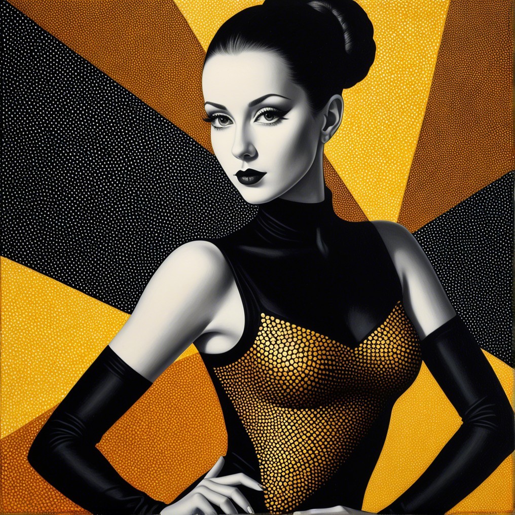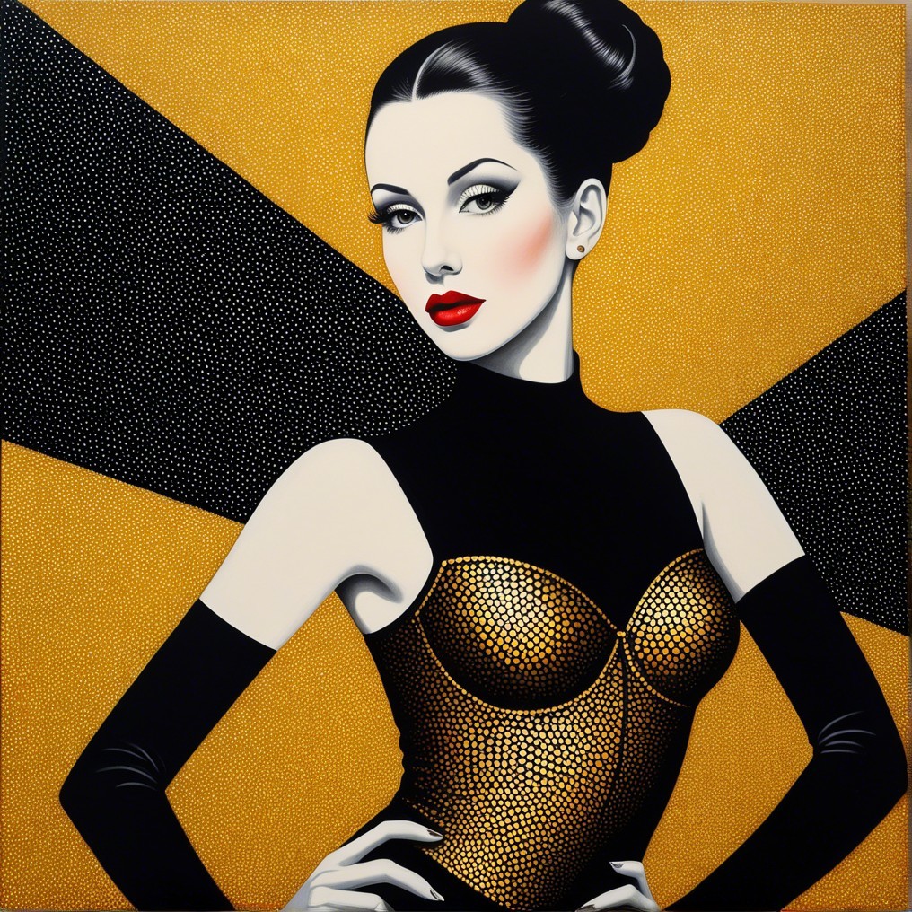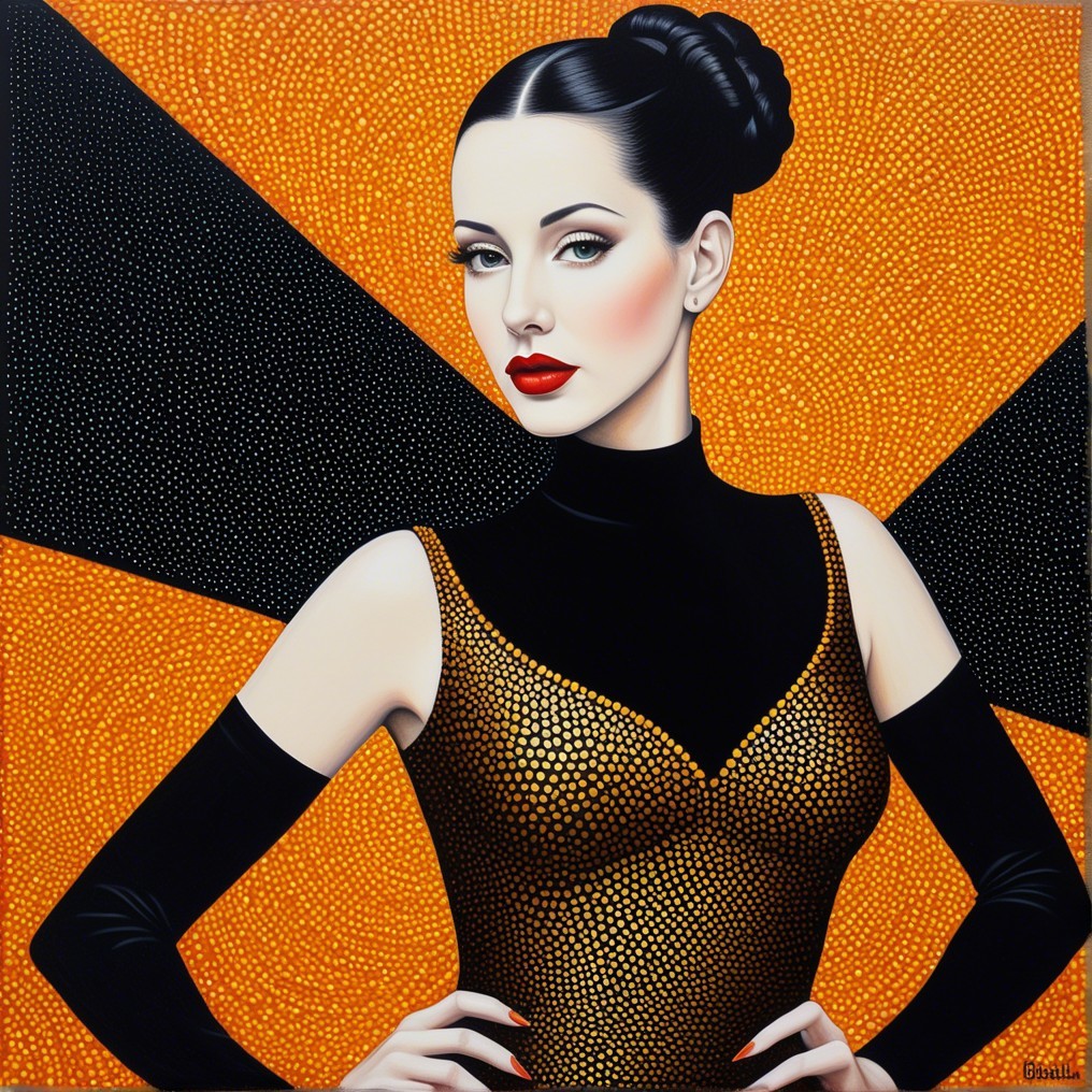 The image features a glamorous woman with striking red lips and dark hair styled elegantly. She wears a black outfit adorned with gold dots, set against a vibrant red and yellow background.