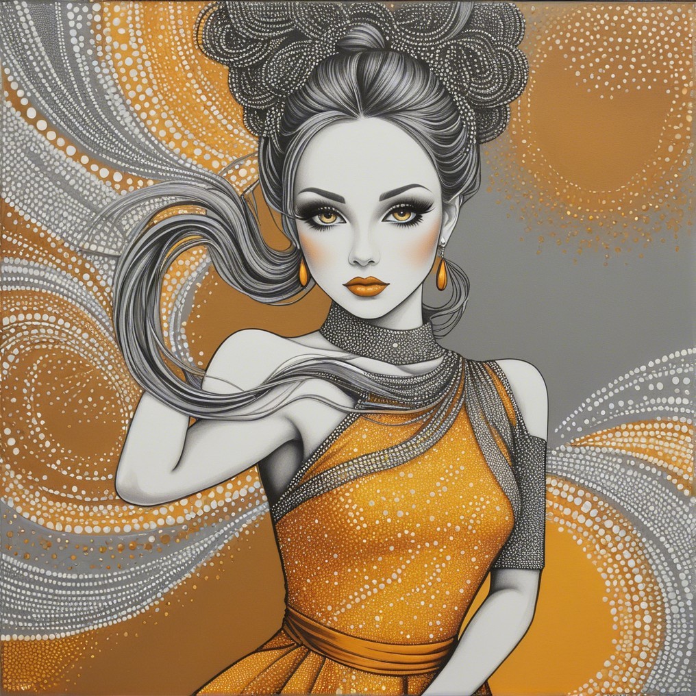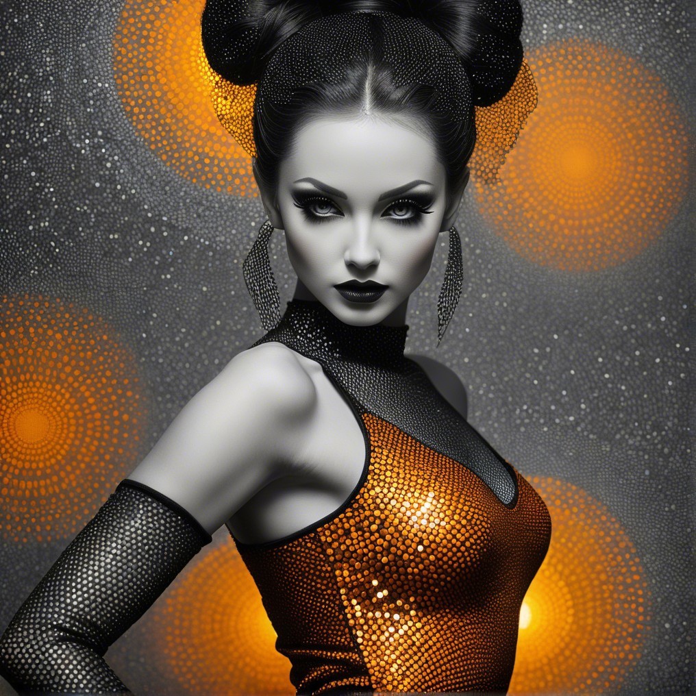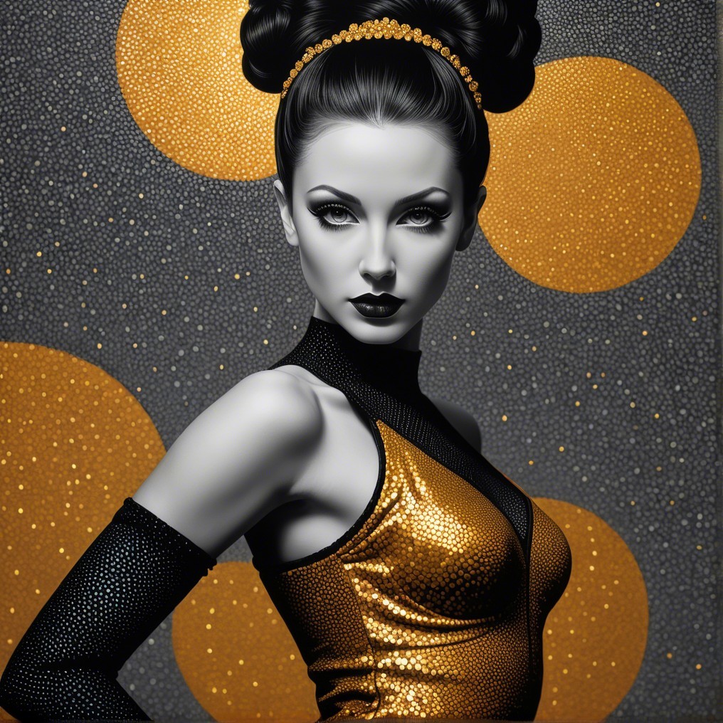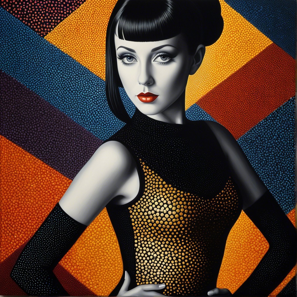 The image features a glamorous woman with striking red lips and dark hair styled elegantly. She wears a black outfit adorned with gold dots, set against a vibrant red and yellow background.