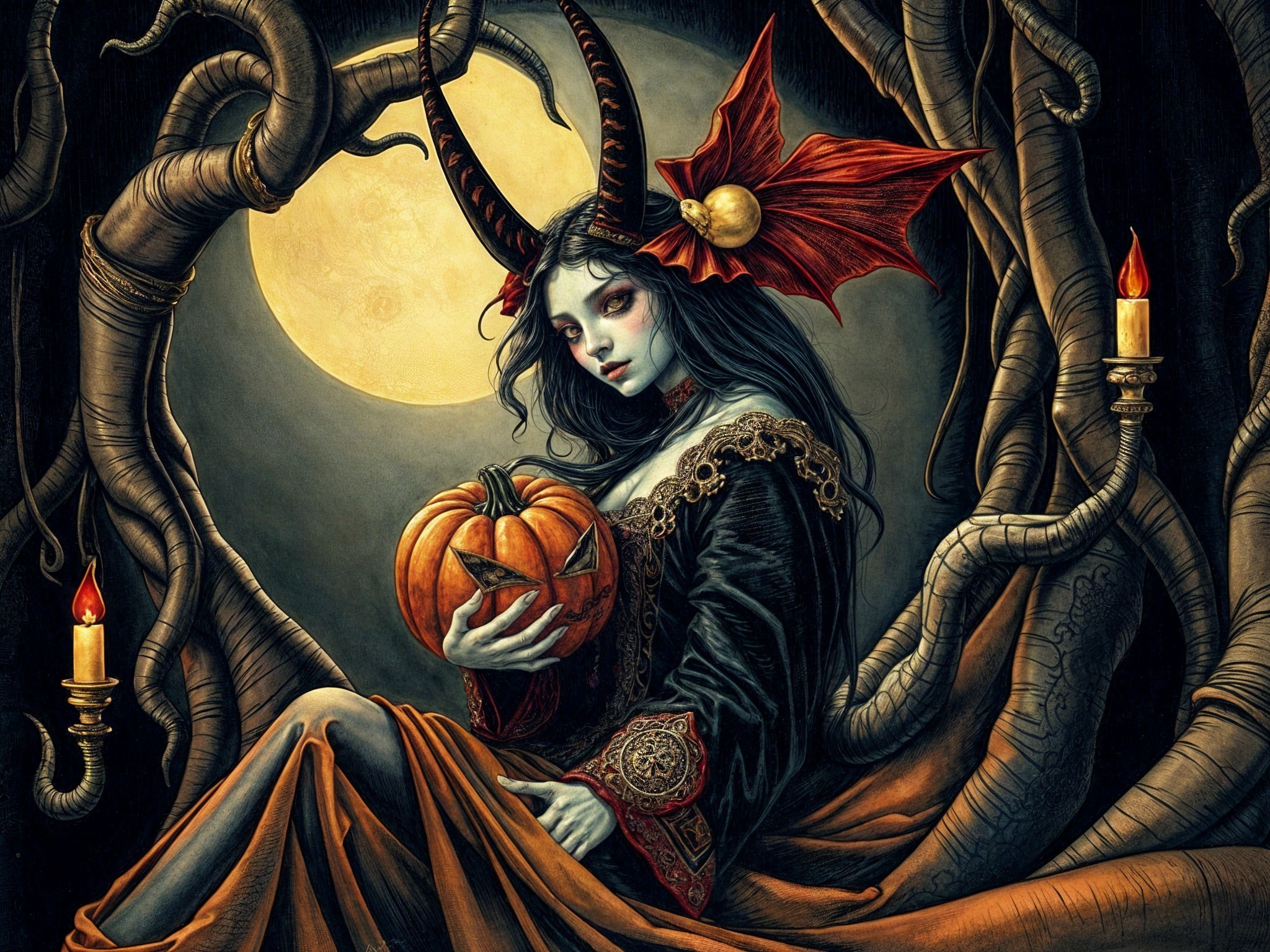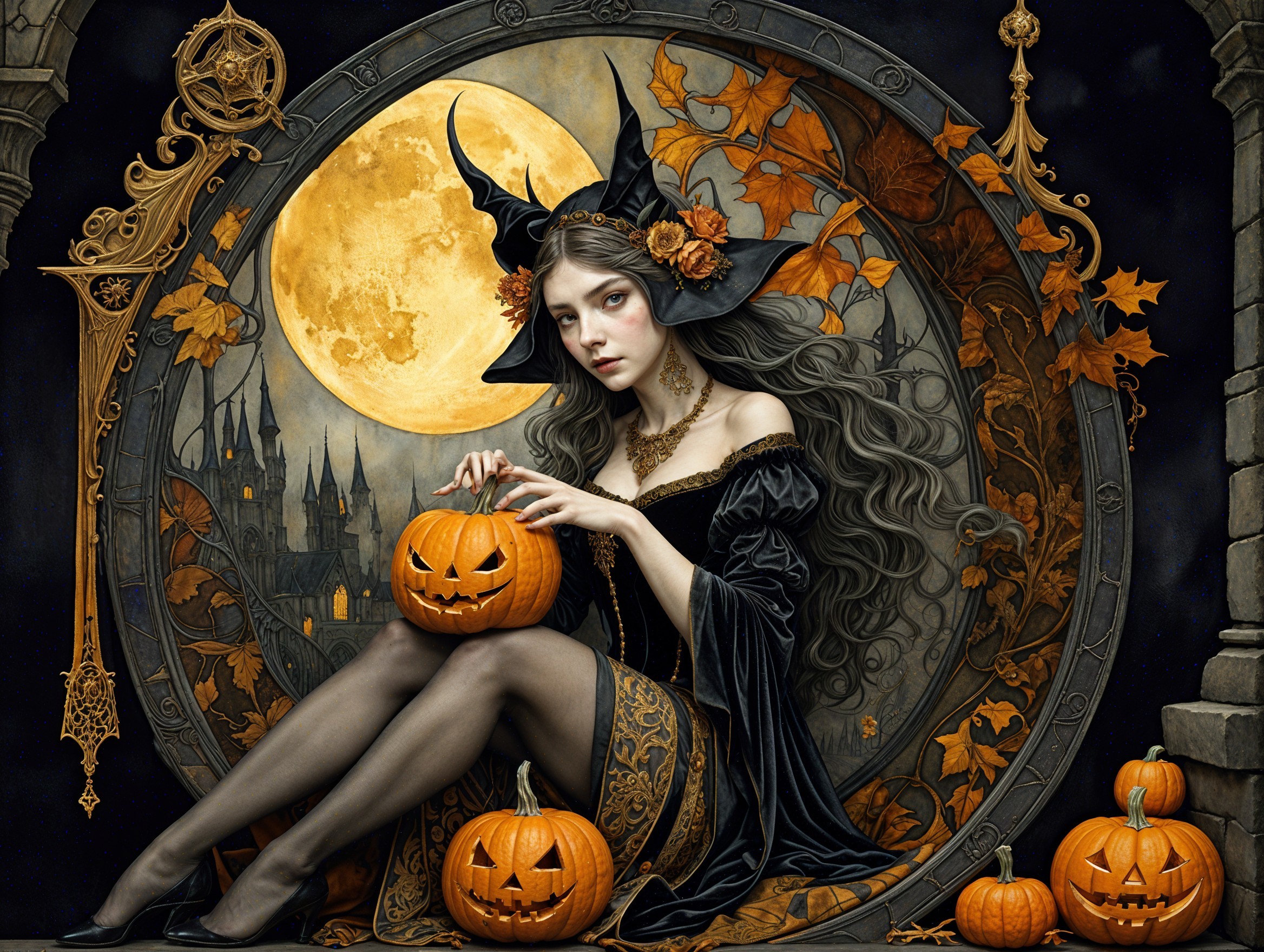 Legend of the Girl of the underworld. Halloween. Medieval Artists art nouveau Style, Velvet Black, Shabby, Dull Gold, Amber Gray, Golden Ratio, Surreal Fantasy, Elegant, High Definition Ultra Fine 3D Line, Zenangle Style, Watercolor Patchwork ,