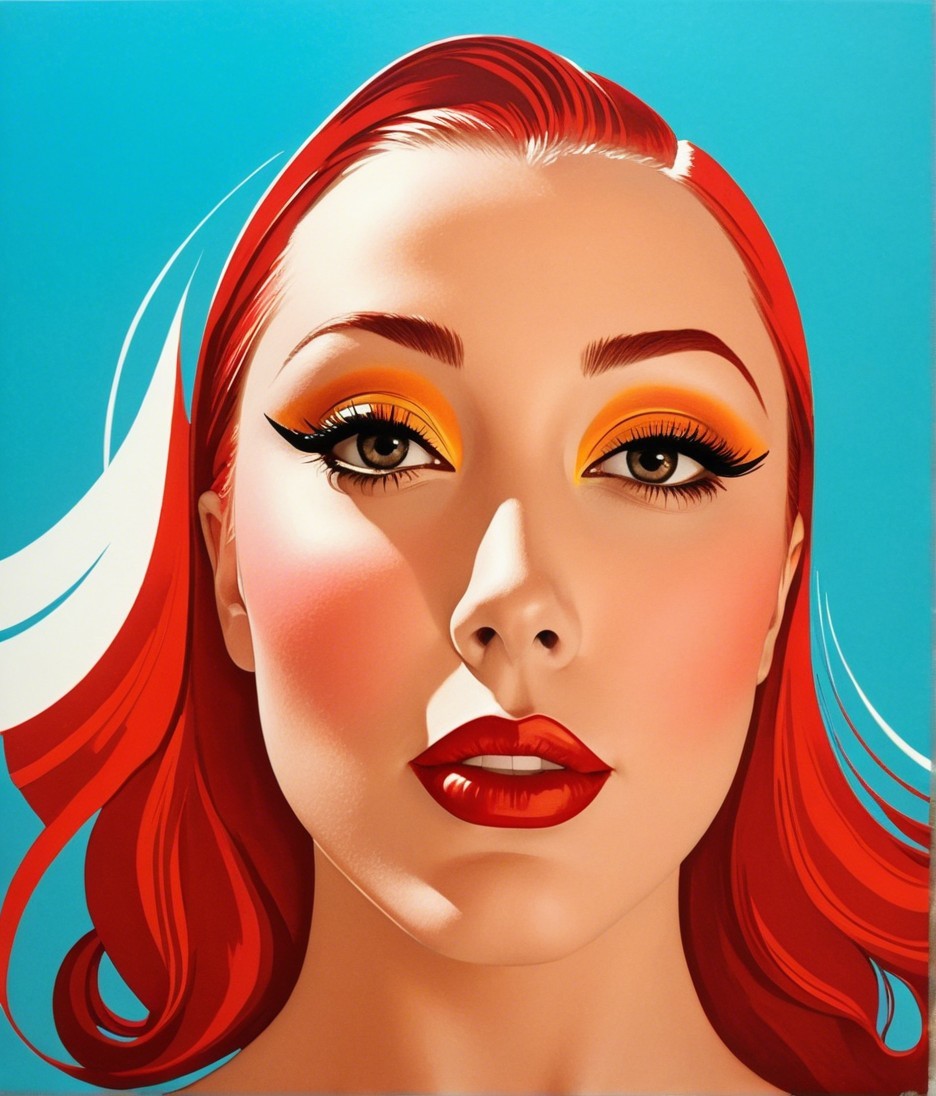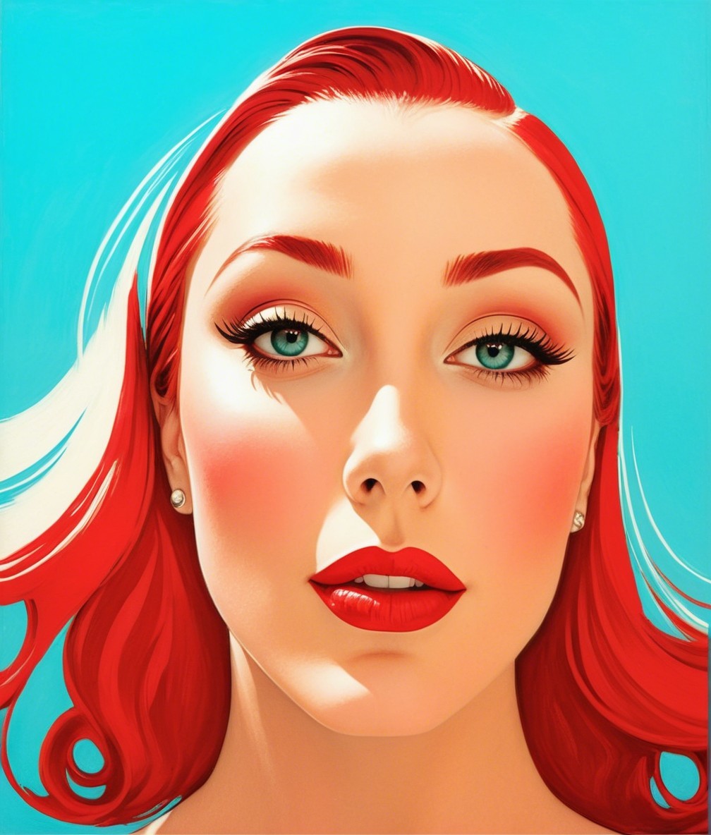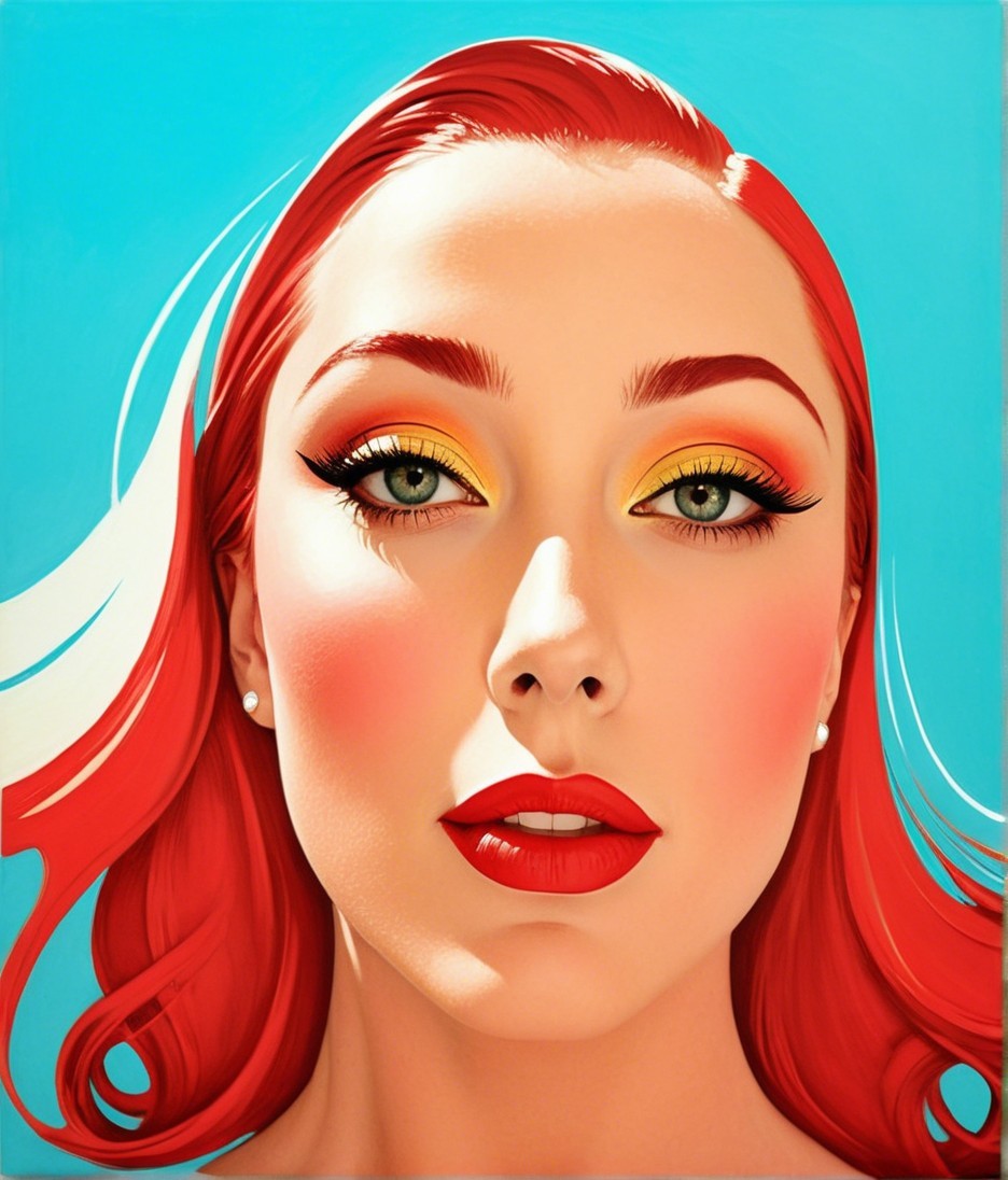 A striking portrait of a woman with vibrant red hair and bold makeup, featuring golden eyeshadow and red lips, set against a bright blue background. The artwork exudes a modern pop art aesthetic.
