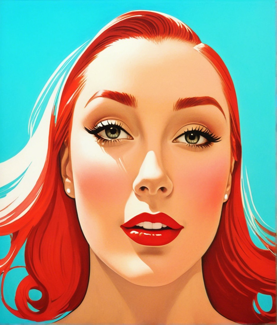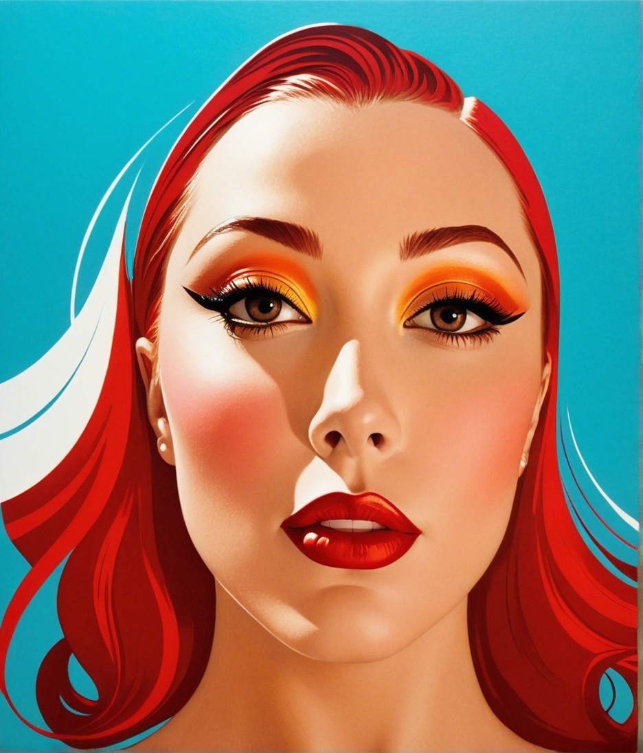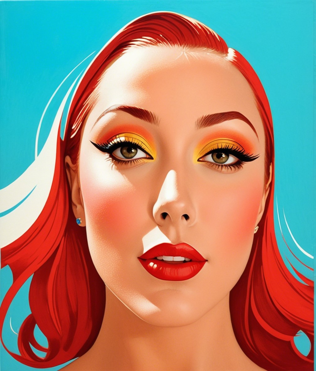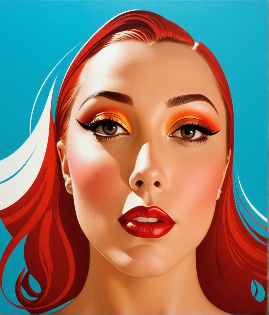 A striking portrait of a woman with vibrant red hair and bold makeup, featuring golden eyeshadow and red lips, set against a bright blue background. The artwork exudes a modern pop art aesthetic.