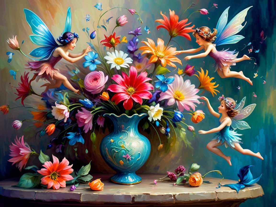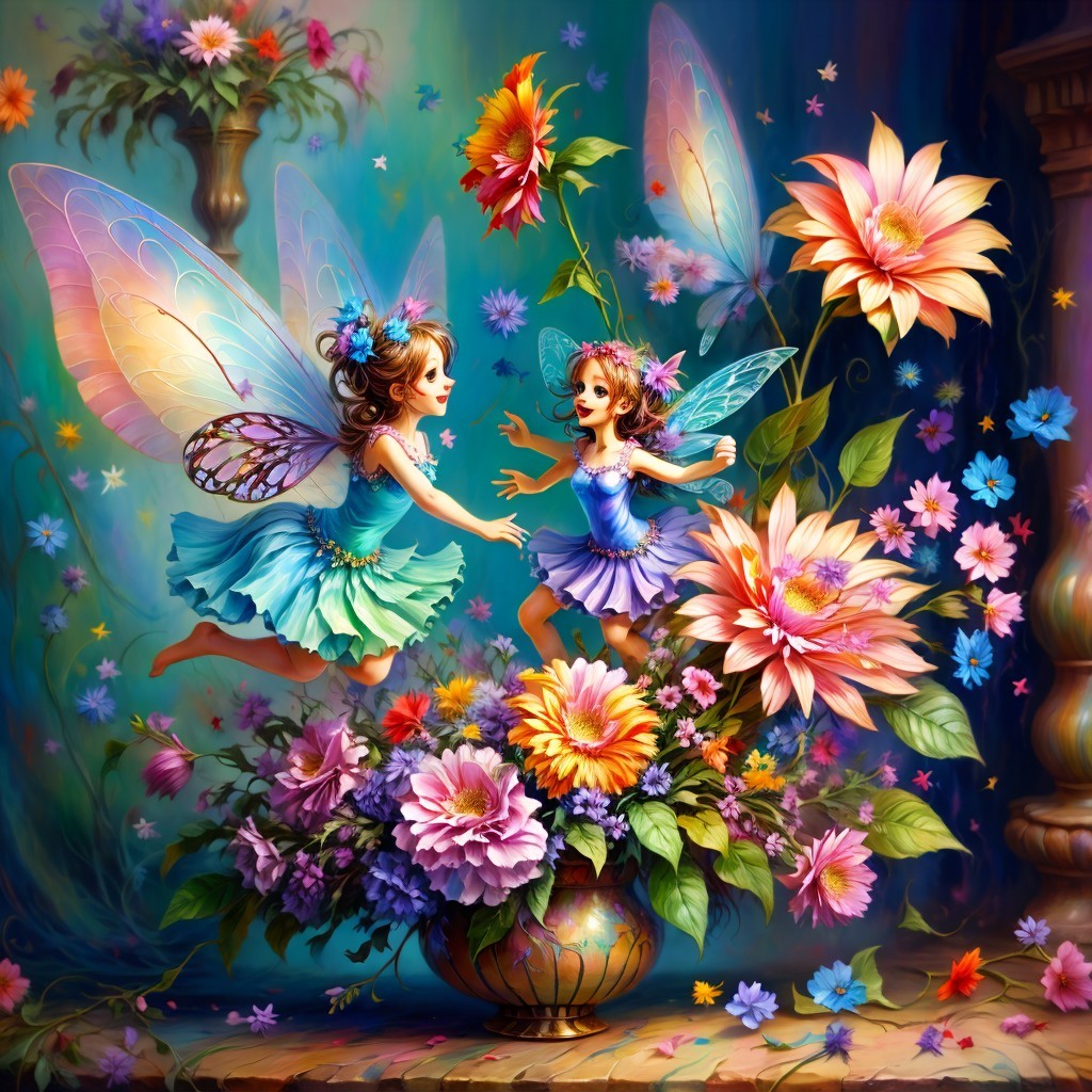 Two magical fairies dance joyfully amid vibrant flowers, surrounded by a colorful, enchanting garden. Their delicate wings shimmer in the soft light, creating a whimsical, dreamlike atmosphere.