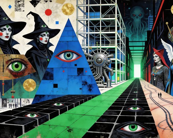 A surreal artwork featuring two robotic humanoid figures with intricate details against a cosmic backdrop with planets and steampunk elements.
