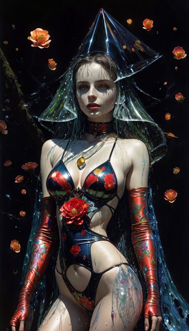 Prompt: a highly detailed illustration of a sexy witch, woman soaking wet in small waterfall cosmic , by Joe Chiodo, Cuno Amiet, Frank Auerbach, Seb McKinnon