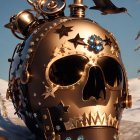 A vibrant, colorful LEGO sculpture of a skull sits in a scenic landscape, adorned with flowers and surrounded by playful birds, creating a whimsical and artistic atmosphere.