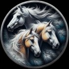 The image features three majestic white horses with flowing manes, depicted in a circular arrangement against a dark background, exuding grace and powerful beauty.