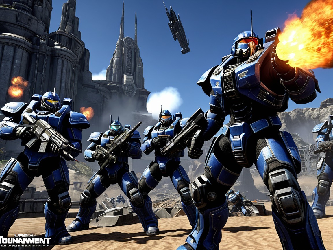 Three futuristic soldiers in sleek metallic armor stand in a war-torn city, illuminated by explosions and lightning. Their weapons are ready as they face an intense battlefield.