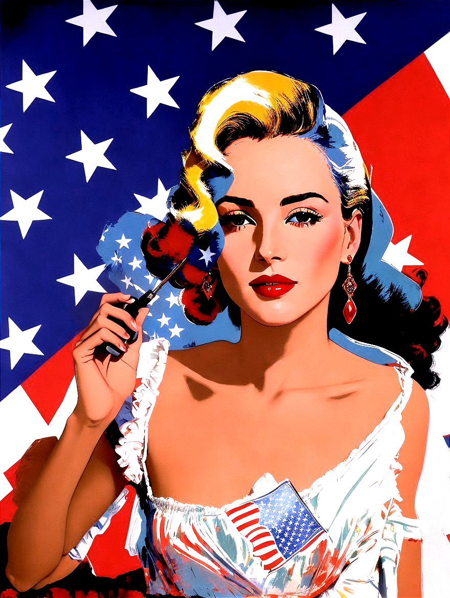 A vintage-style illustration of a woman with blonde hair holding a flower, with a background featuring the American flag and stars.