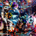 In a vibrant, surreal setting, an elegantly dressed iguana in a top hat lounges with a cigarette. Colorful butterflies and coral surround it, blending whimsy with rich, dreamlike visuals.