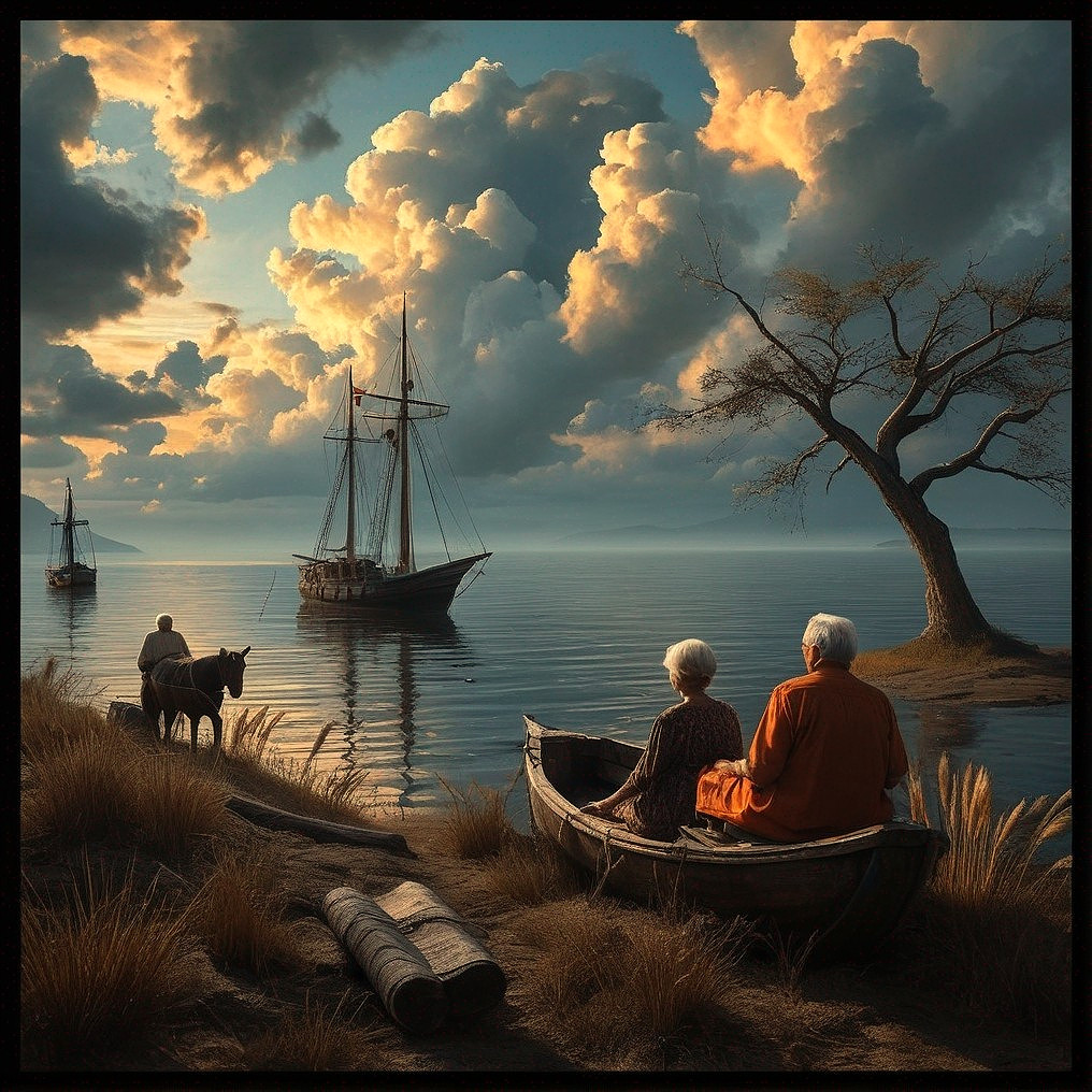 An elderly couple sits by the lake, watching sailing ships at dusk, with a serene sky above and a dog by their side.