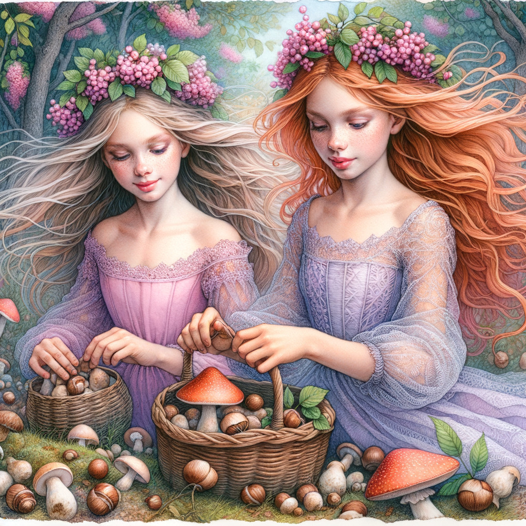 Two enchanting girls, one with long blonde hair and the other with flowing red locks, sit in a vibrant, flower-filled forest. They hold baskets filled with colorful berries and mushrooms, radiating magic.