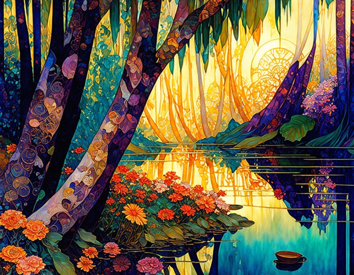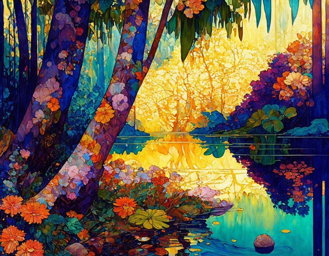 A vibrant landscape featuring colorful trees and blooming flowers by a calm, reflective waterway. The scene is illuminated by warm golden hues, creating a tranquil, enchanting atmosphere.