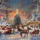 A beautiful Christmas village scene is depicted with a snow-covered landscape at dusk. The sky above transitions from a warm, orange-yellow sunset on the left to a deep, dark blue on the right, adorned with a few scattered clouds. A prominent and dazzling Christmas tree, towering upwards with a bright colors. Thomas Kinkade oil painting.