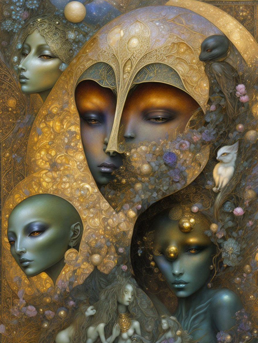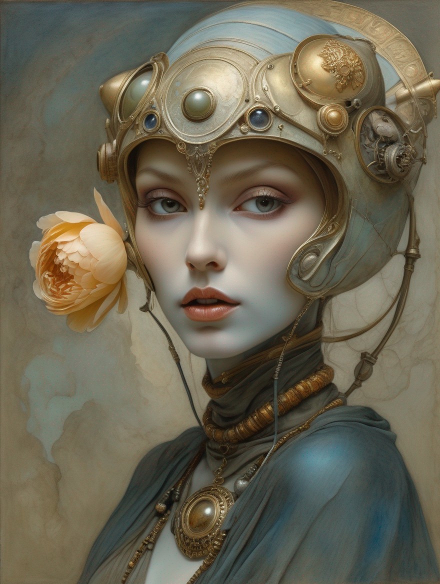 A fantasy portrait of an ethereal woman in an intricate helmet holding a stand with a glowing orb, with a surreal twilight backdrop.
