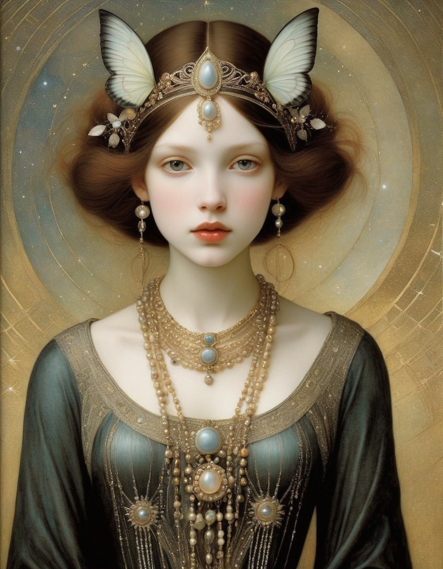 Pale-skinned woman with starry hair in crescent moon against night sky.