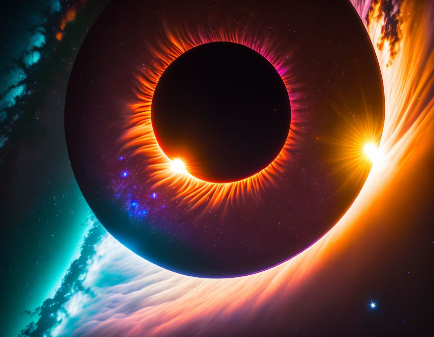 Vibrant digital artwork: Cosmic event with celestial bodies in eclipse